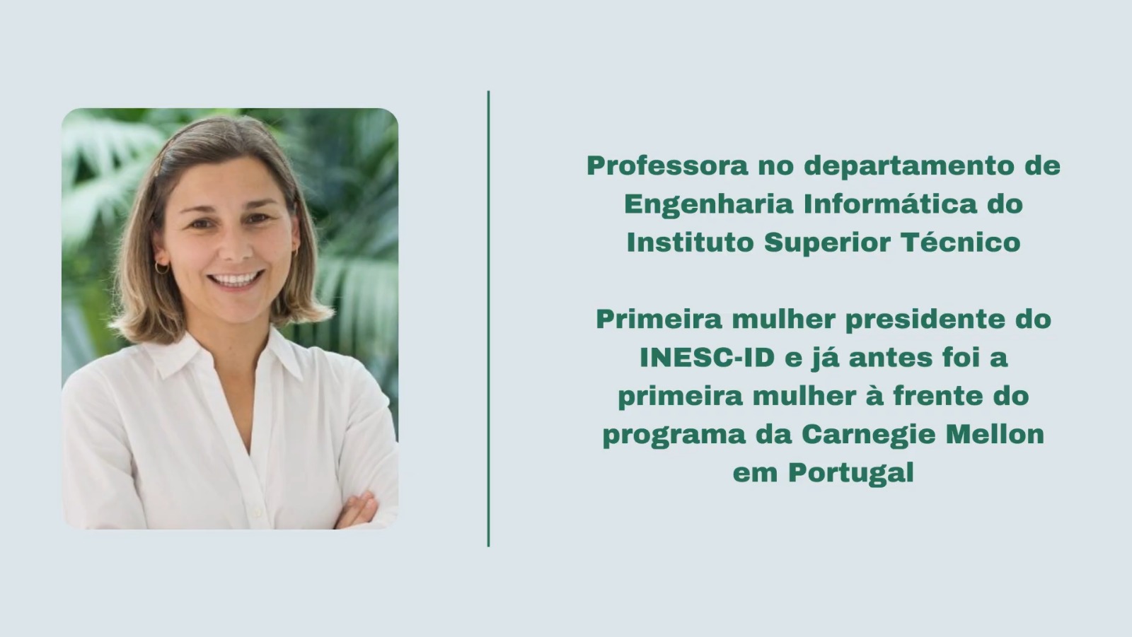 Primeira mulher presidente do INESC-ID e já antes foi a primeira mulher á frente do programa da Carnegie Mellon em Portugal
