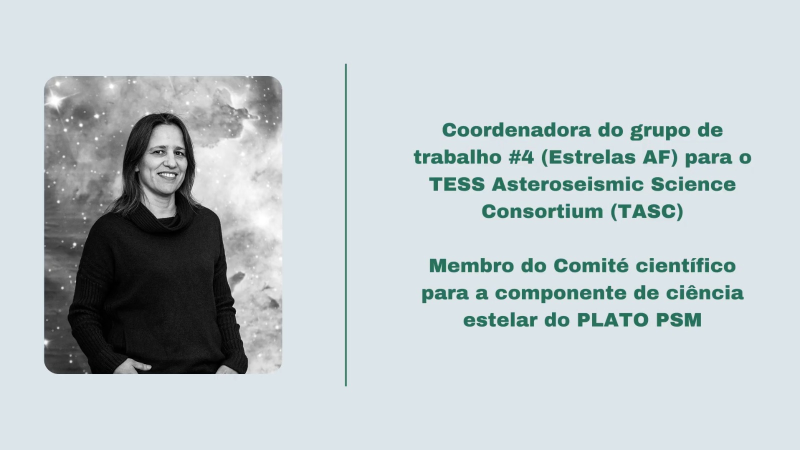 Coordenadora do grupo de trabalho #4 (Estrelas AF) para o TESS Asteroseismic Sciense Consortium (TASC)
